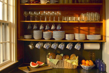 There is a large enclosed porch at the east end of the house with ample wicker chair seating. This makes for a beautiful breakfast area with lots of sunlight.